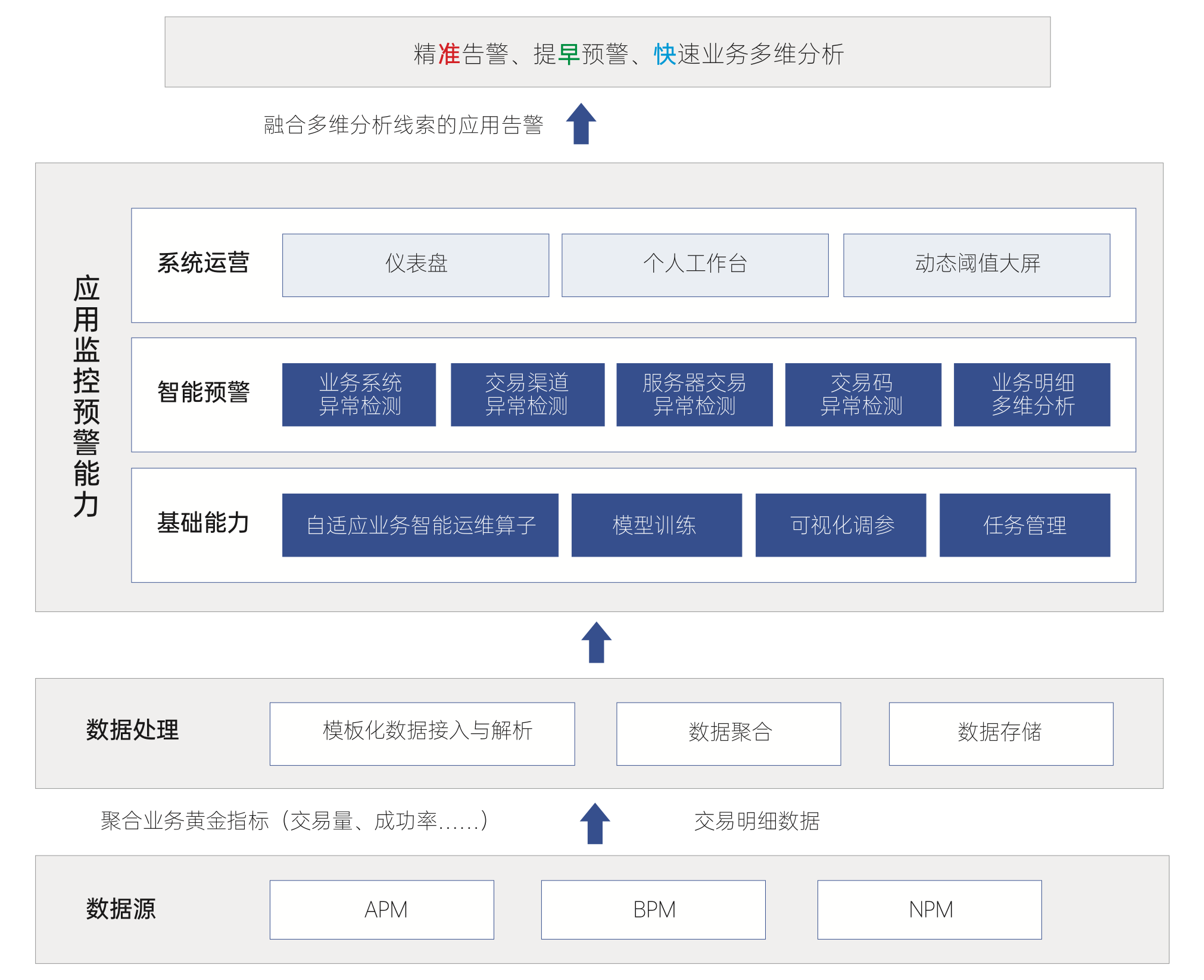 通过接入交易明细数据,系统对数据自动解析、聚合和监控告警。通过人工智能算法,系统自动学习告警阈值,无需人工配置,达到更早和更准地发现业务故障,可大规模精细化的扩大监控范围。此外,在告警后系统快速进行业务明细多维分析,辅助故障排查,给出准确故障线索。
