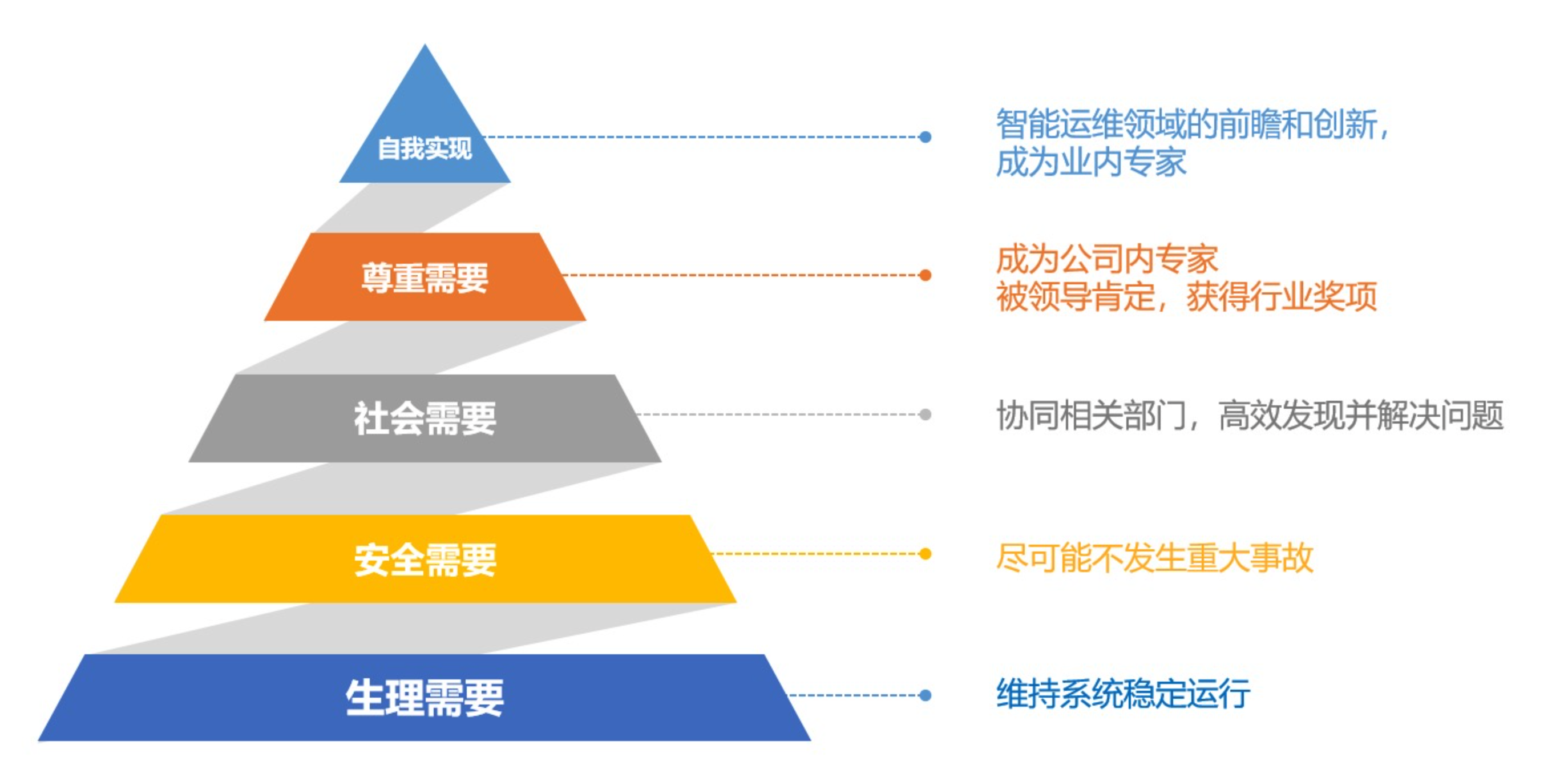 随着金融行业数字化程度越来越高、业务需求不断激增、系统规模越来越大、组件监控粒度越来越细、以及新技术和新组件不断引入,导致运维工程师被海量运维监控数据淹没,而利用AI技术解决运维问题成为行业必然趋势。在此过程中,运维人员对AIOps的需求符合马斯洛需求金字塔模型,即从最基础的生理需要(通过AIOps解决基础业务需要)到最顶端的自我实现(在AIOps领域的自我价值实现),而这实际上是伴随着对AIOps价值探索不断提升的,而效果是贯穿需求金字塔的隐含支撑。