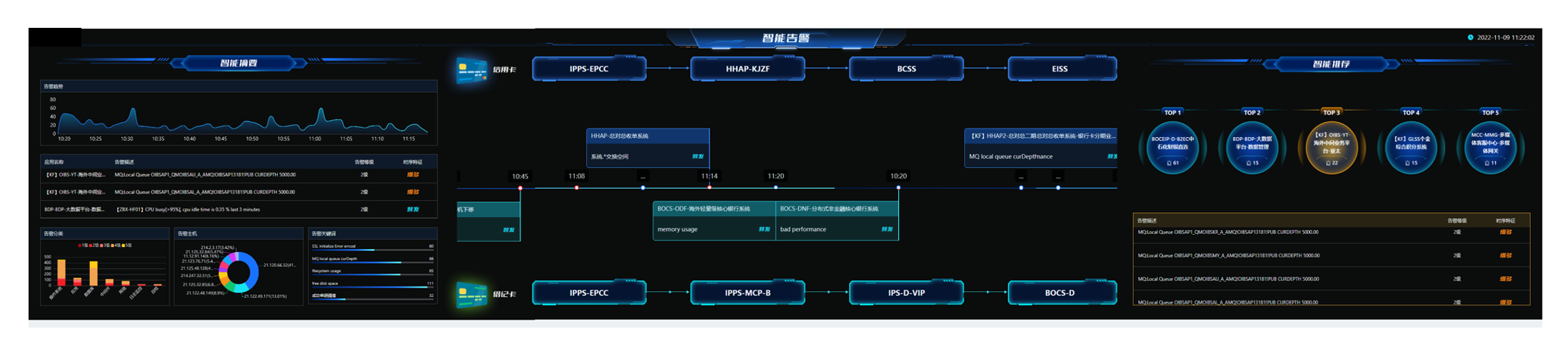 在大规模故障发生时,通过针对重要业务,构建告警智能分析大屏,实现从告警风暴识别、告警路径分析到可疑应用推荐的全栈能力。而在重保场景下对告警数据进行实时智能分析,从而保障业务的健康度和业务连续性。
