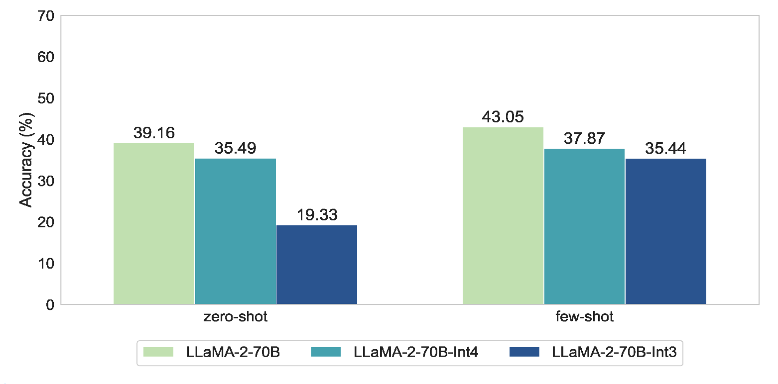上图展示了LLaMA-2-70B在中英文客观问题上的不同量化参数的准确性。我们使用Naive设置下进行了zero-shot和few-shot评估。显然,在推理过程中使用量化会降低LLM的性能。