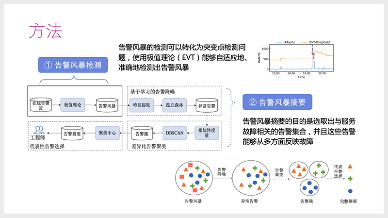 第二篇论文“告警风暴摘要”,聚焦在告警风暴这一运维问题当中,提出了用动态剧变点检测方法准确检测告警风暴,并提出一套有效的告警风暴摘要算法,包括噪声告警过滤、告警聚类和典型告警选择。