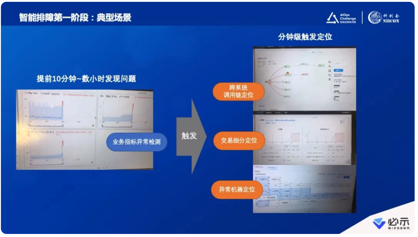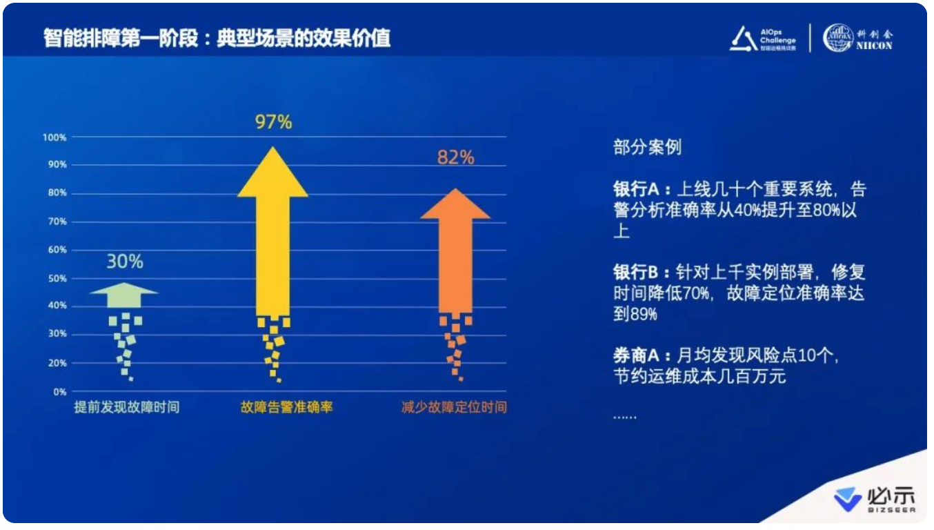 这个模式是过去几年智能运维实践最主流的一种方式,确实带来了很多业务价值。比如发现故障时间提前30%,比如故障告警准确率可以达到97%,比如故障的定位时间减少82%。下图右侧也列了几个具体案例,汇总了一些实践中的数据。这是我们利用第一阶段专家定义好的“桶”、再由算法专业人士做好算法的模式,所带来的一系列成效。