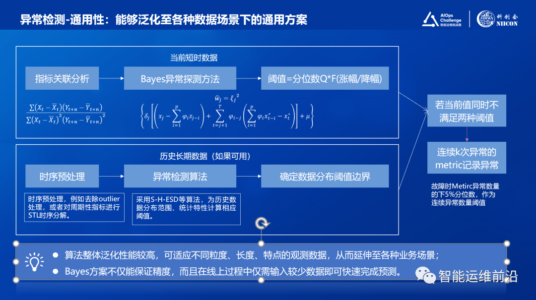 基于Bayes方法,设计以下通用模型,能够泛化至各种数据场景。首先,对于某一实时采集值,取该采集值前5min或10min的采集值,结合Bayes方法对当前时刻进行动态阈值估计,从而完成异常性判定。其次,如果能够利用历史长期数据,就可以应用S-H-ESD等算法进行额外阈值估计,通过历史信息进一步提高精度。平安科技公司内部生产系统中的异常检测方案会参考历史2周数据从而进一步提高精度。