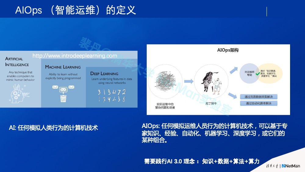 至此,我们可以清晰定义AIOps智能运维(AI+Ops)了。我们说,AI是任何模拟人类行为的计算机技术。AIOps是什么?就是任何模拟运维人员行为的计算机技术,它可以基于专家知识、经验、自动化、机器学习、深度学习或它们的某种组合。从另一个角度说,不要因为用到了自动化或硬逻辑,就判定其不是AI 或AIOps。我们要做的是践行“知识+数据+算法+算力”的AI 3.0概念,这也是AI应用的大势所趋。