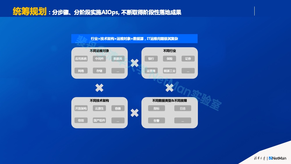 首先,相信大家到现在已经都了解不同运维场景用的技术和算法是不一样的(如下图所示我在清华实验室发表的论文中采用过的基础算法),很难用黑盒方法来做。