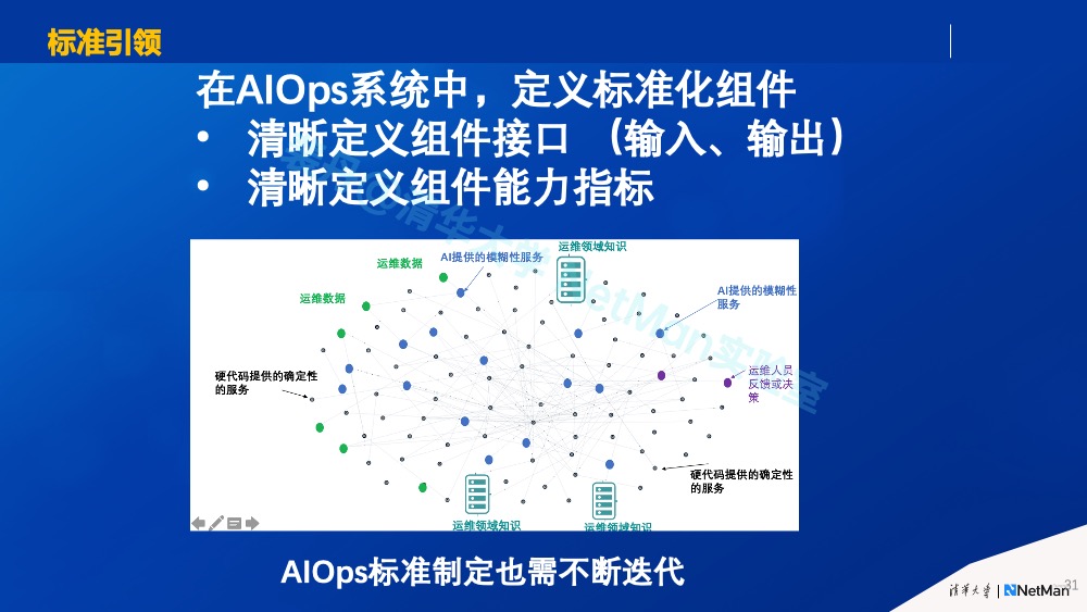 最终我们希望,在同一套智能运维标准引领下,在一个由标准构建起来的大“平台”上(参见移动通讯网络中的4G,5G标准构建其的大“平台”),生态各方进行知识沉淀(用户专家的知识、服务供应商专家的知识、厂商的专家的知识)、算法及代码的沉淀(学术界、厂商、用二次开发、服务商二次开发)、以及数据治理标准的沉淀、服务化组件的沉淀,以及AIOps相关的自动化工具的沉淀,在遵循生态共同制定的标准的前提下,实现高效互通互联,指数级加速AIOps落地。